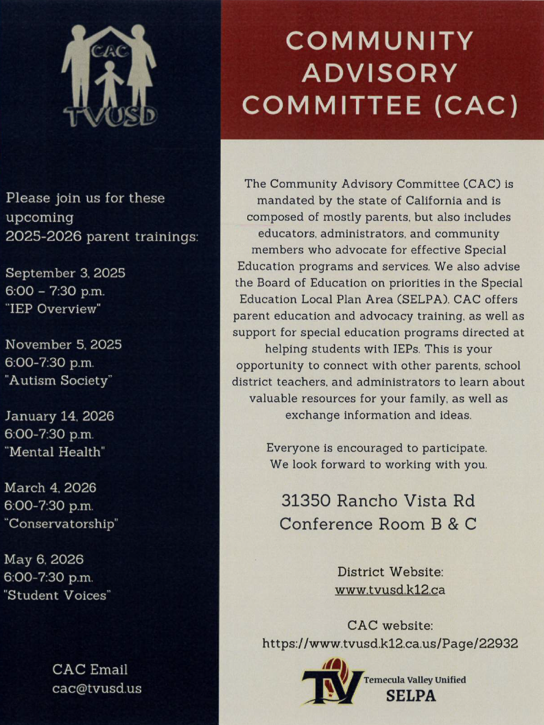 10:30 am: Kid's Story Time at La Taza Community Coffeehouse (Lake Elsinore) – ![]() 3:00 pm: Adaptive Basketball 10+ (Indio) – ![]() Two Sessions3-3:45 PM OR 4-4:45 PM3:00 pm: MUSD SEPLA C.A.C: Coping Tool for Families (Joshua Tree) – ![]() 6:00 pm: Desert Sands Unified School District SEPAC Meeting (La Quinta) – ![]() |