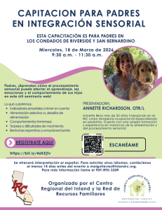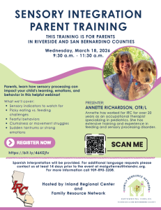 This training is for parents of children in Riverside & San Bernardino counties only. Please do not register if you do not live in these counties as space is limited. Parents will learn about sensory processing and how it affects learning and behaviors. Presented by Annette Richardson, OTR/L. Annette has worked for IRC for over 20 years as an occupational therapist specializing in pediatrics. She has extensive training and experience in feeding and sensory processing disorder.